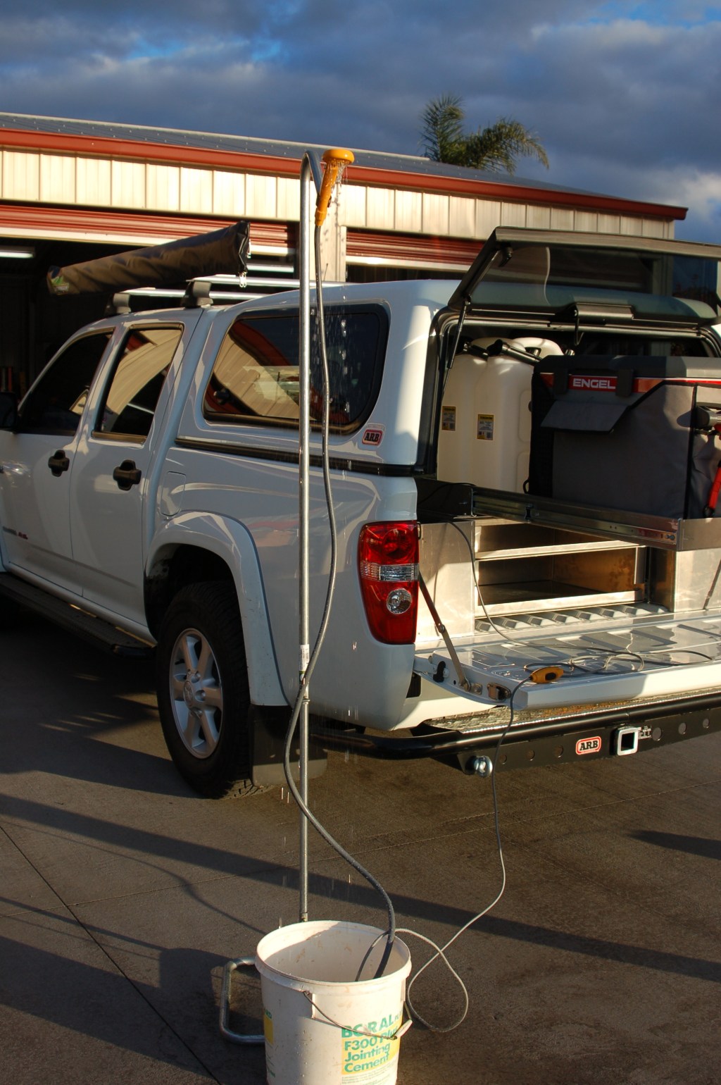 We tested out our new shower. It is a 12 volt shower it uses a pump to pump the water from a bucket to the shower head. It is no five star, high pressure shower but it will be well looked forward to after a hard day on the road.