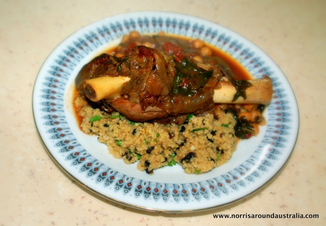 Brown the Shanks in a fry pan and transfer to slow cooker, camp oven or crock pot. In the fry pan fry off some squashed garlic, chopped onion and then add canned tomatoes, Moroccan mixed spice and beef stock and transfer mixture to lamb shanks.Place on coals if using camp oven or in the oven if using the crock pot. Cook for 1 and then add drained chickpeas. After a further 1/2 an hour add some spinach leaves.
