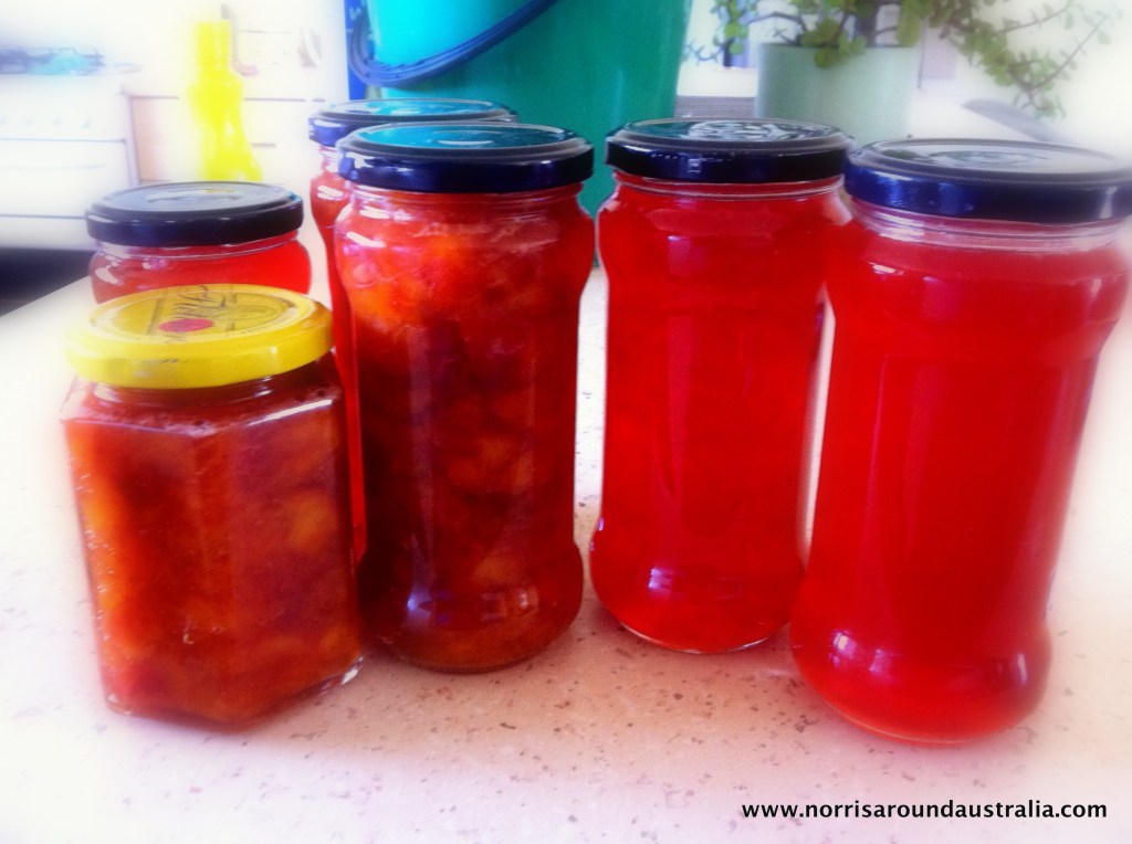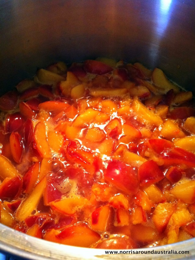I love home-made jam. This one is simple – roughly for every two kilo’s of plums, mix three cups of castor sugar and a squeeze of fresh lemon juice. For this batch I made several bottles with a chunkier version for Shaun and a few of bottles of smooth conserve.